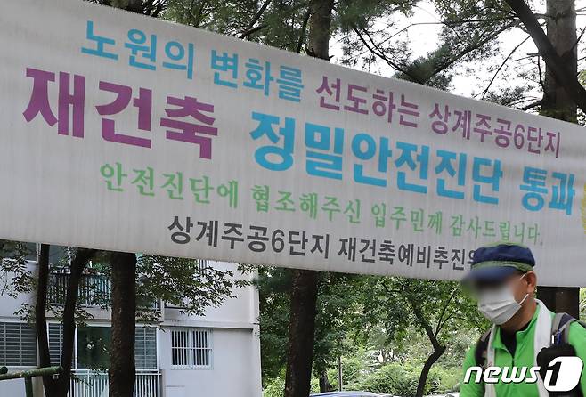 (서울=뉴스1) 송원영 기자 = 정부가 내년부터 2027년까지 5년간 서울에 50만 가구를 포함해 전국에 주택 270만 가구의 주택을 공급할 계획이다. 특히 재건축 안전진단과 부담금 등 규제를 대폭 완화해 재건축과 재개발로 서울에서 24만 채를 공급한다. 이는 1기 신도시인 분당신도시의 2.5배와 맞먹는 물량이다. 사진은 17일 서울 노원구 상계주공아파트에 걸린 재건축 관련 현수막 모습. 2022.8.17/뉴스1