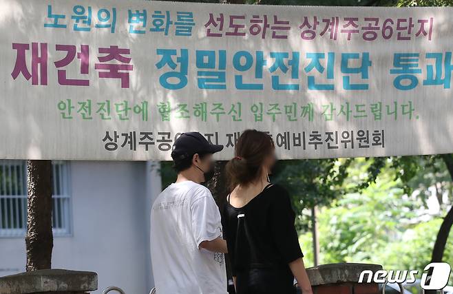 (서울=뉴스1) 송원영 기자 = 정부가 내년부터 2027년까지 5년간 서울에 50만 가구를 포함해 전국에 주택 270만 가구의 주택을 공급할 계획이다. 특히 재건축 안전진단과 부담금 등 규제를 대폭 완화해 재건축과 재개발로 서울에서 24만 채를 공급한다. 이는 1기 신도시인 분당신도시의 2.5배와 맞먹는 물량이다. 사진은 17일 서울 노원구 상계주공아파트에 걸린 재건축 관련 현수막 모습. 2022.8.17/뉴스1