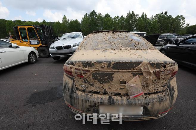 [이데일리 이영훈 기자] 8일부터 이틀간 내린 기록적인 폭우에 침수 피해를 입은 차량들이 17일 오후 경기도 과천 서울대공원 주차장에 마련된 삼성화재, KB손해보험 임시 보상서비스센터에 주차돼 있다.