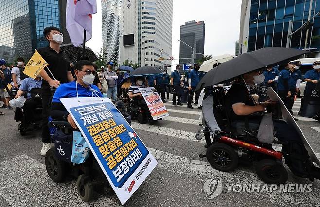 (서울=연합뉴스) 홍해인 기자 = 전국장애인차별철폐연대를 비롯한 장애인단체 회원들이 17일 서울 중구 서울지방고용노동청 앞에서 중증장애인 고용촉진 특별법 제정을 촉구하며 행진을 하고 있다. 2022.8.17