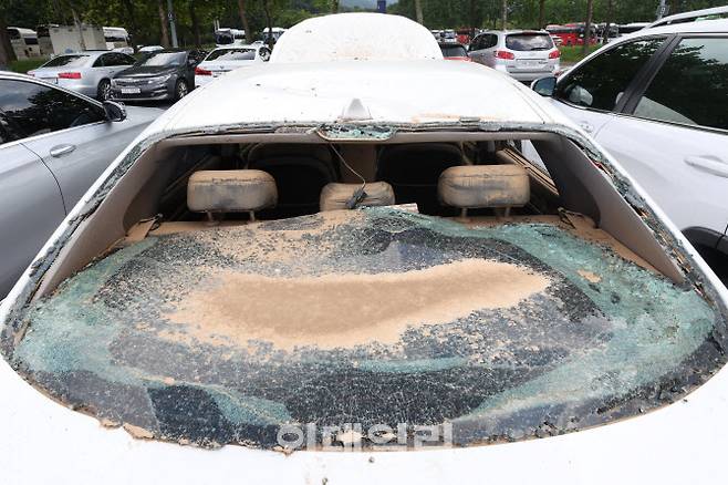 [이데일리 이영훈 기자] 8일부터 이틀간 내린 기록적인 폭우에 침수 피해를 입은 차량들이 17일 오후 경기도 과천 서울대공원 주차장에 마련된 삼성화재, KB손해보험 임시 보상서비스센터에 주차돼 있다.