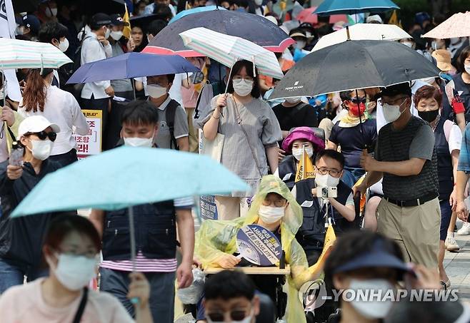 (서울=연합뉴스) 홍해인 기자 = 전국장애인차별철폐연대를 비롯한 장애인단체 회원들이 17일 서울 중구 서울지방고용노동청 앞에서 중증장애인 고용촉진 특별법 제정을 촉구하며 행진을 하고 있다. 2022.8.17
