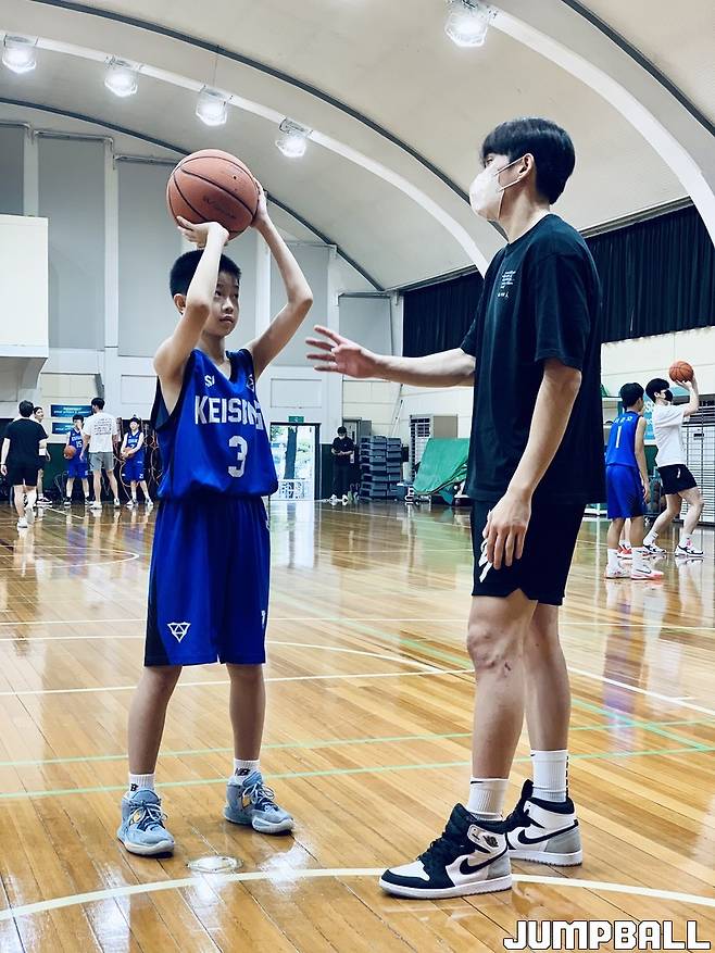 이대성이 먼저 3점슛 라인 밖 왼쪽 45도 지점에서 치고 들어간 뒤 점퍼를 던졌다. 뒤이어 양준우도 그대로 따랐다. 이대성은 양준우가 슛을 한 번씩 던질 때마다 계속 조언을 건넸다. 때론 시범을 보이면서 자세와 상황을 설명했다.