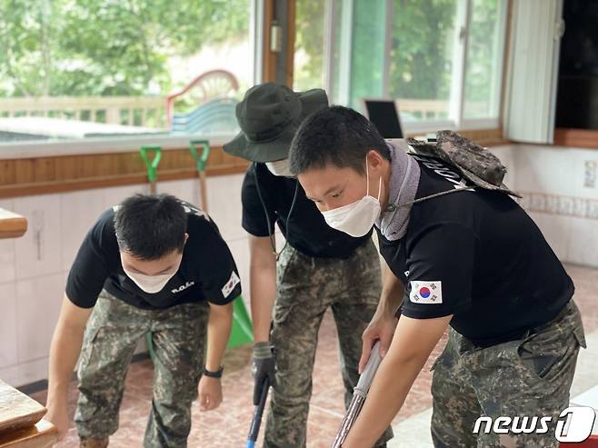 (강릉=뉴스1) 윤왕근 기자 = 육군 8군단 장병들이 17일 오후 게릴라성 호우로 피해를 입은 강원 강릉시 주문진읍 장덕리에서 복구 작업을 돕고 있다.(육군 8군단 제공) 2022.8.17/뉴스1