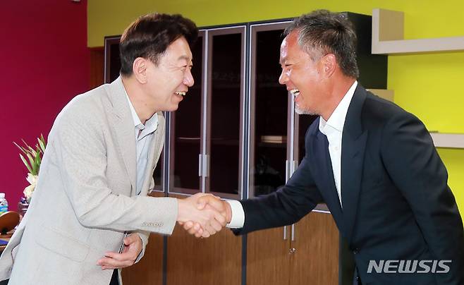 [전주=뉴시스] 김얼 기자 = 우범기 전주시장(왼쪽)과 전은수 자광홀딩스 대표가 17일 전북 전주시 전주시청 시장실에서 만나 악수를 나누고 있다. 2022.08.17. pmkeul@newsis.com