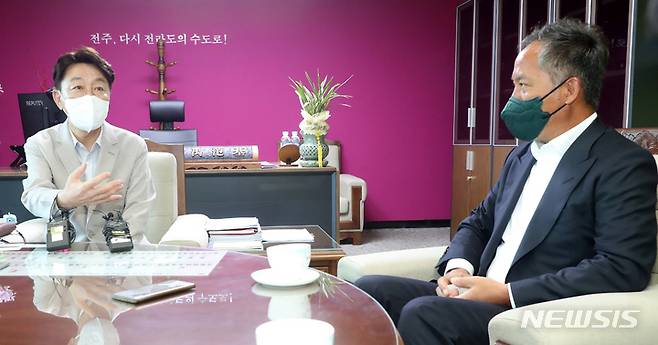 [전주=뉴시스] 김얼 기자 = 우범기 전주시장(왼쪽)과 전은수 자광홀딩스 대표가 17일 전북 전주시 전주시청 시장실에서 만나 면담을 갖고 있다. 2022.08.17. pmkeul@newsis.com