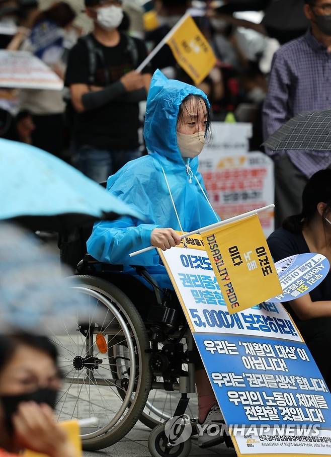 (서울=연합뉴스) 홍해인 기자 = 전국장애인차별철폐연대를 비롯한 장애인단체 회원들이 17일 서울 중구 서울지방고용노동청 앞에서 중증장애인 고용촉진 특별법 제정을 촉구하며 행진에 앞서 결의대회를 갖고 있다. 2022.8.17