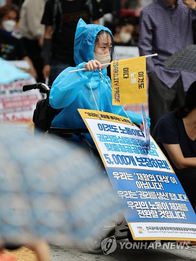 (서울=연합뉴스) 홍해인 기자 = 전국장애인차별철폐연대를 비롯한 장애인단체 회원들이 17일 서울 중구 서울지방고용노동청 앞에서 중증장애인 고용촉진 특별법 제정을 촉구하며 행진에 앞서 결의대회를 갖고 있다. 2022.8.17