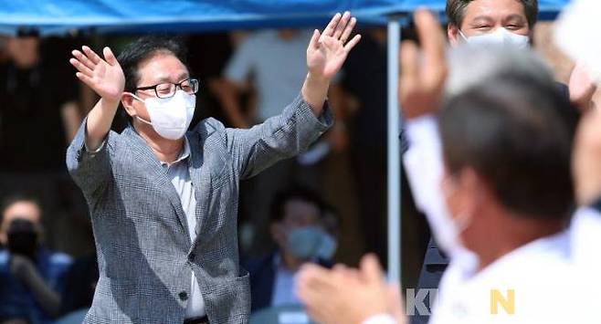 17일 강원 화천생활체육공원에서 열린 제20회 4개군(철원·화천·양구·인제) 이장 한마음 대회에서 최상기 인제군수가 인제군이장대표들이 입장하자 두손을 들어 환영하고 있다.