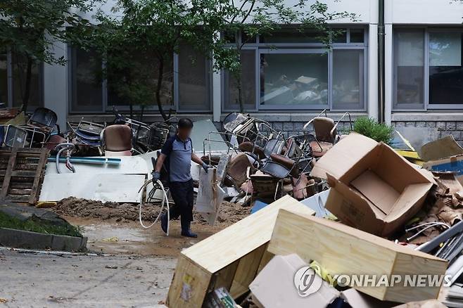 (서울=연합뉴스) 이지은 기자 = 지난주 내린 집중호우로 침수 등 피해를 본 서울대 사범대학이 2학기 대면 수업 일부를 비대면으로 전환하기로 한 가운데 17일 오후 서울 관악구 서울대학교 사범대학 건물 밖에 침수 폐기물이 쌓여있다. 학교 측은 집중호우로 건물이 침수되고 대량의 토사가 유입되는 등 타격을 입어 대면 수업이 물리적으로 불가능하다고 판단했다고 밝혔다. 2022.8.17