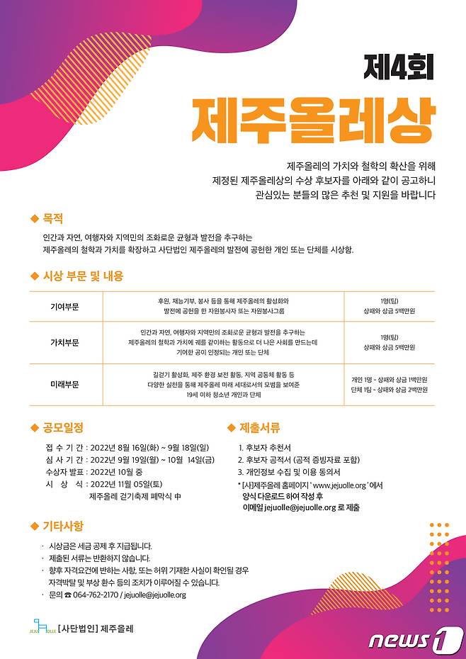 사단법인 제주올레는 9월18일까지 제4회 제주올레상 수상 후보자를 모집한다고 17일 밝혔다.
