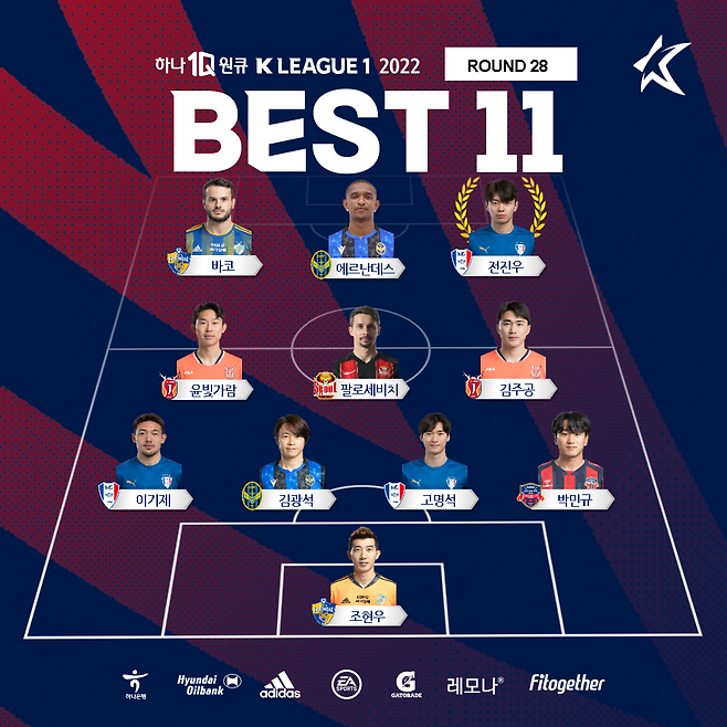 K리그1 28라운드 베스트11에는 GK 조현우(울산), DF 이기제(수원), 김광석(인천), 고명석(수원), 박민규(수원FC), MF 윤빛가람(제주), 팔로세비치(서울), 김주공(제주), FW 바코(울산), 에르난데스(인천), 전진우(수원)가 선정됐다.