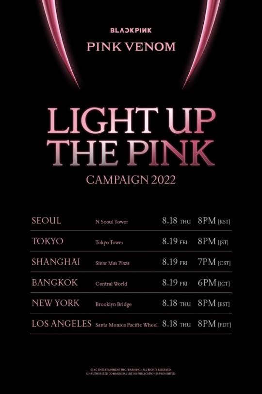 YG 측은 "‘Light Up The Pink’ 캠페인이 진행되는 각 랜드마크 방문 인증 이벤트도 계획됐다"며 "블랙핑크를 사랑해주시는 팬들은 물론 모든 이의 축제가 되길 희망한다"고 바랐다.