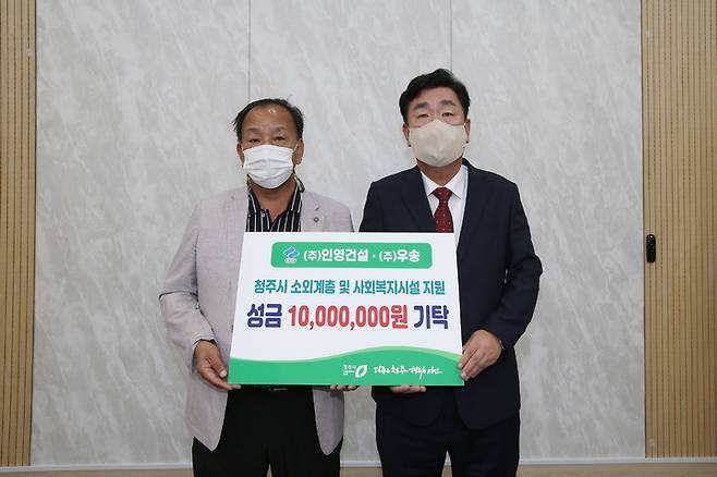 [청주=뉴시스] 임선우 기자 = ㈜우송·㈜인영건설 안병진 대표(왼쪽)이 17일 충북 청주시청 직지실에서 이범석 시장에게 취약계층과 노인복지시설 후원금 1000만원을 기탁하고 있다. 2022.08.17. imgiza@newsis.com