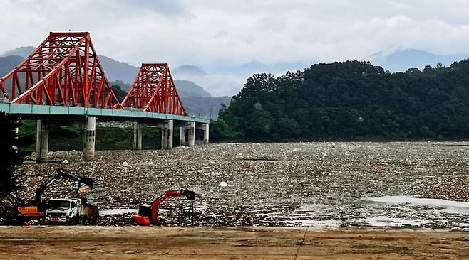 [제천=뉴시스] 이병찬 기자 = 충북 제천시 수산면 옥순대교 청풍호에 17일 상류에서 쓸려내려온 부유 쓰레기가 가득하다.(사진=독자 제공) 2022.08.17. photo@newsis.com