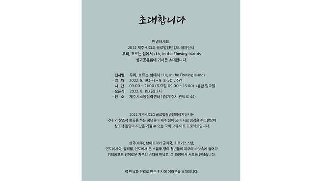 전시는 우리나라(제주)와 남아프리카공화국, 키르기스스탄, 인도네시아, 필리핀, 인도 국적의 청년 예술가 22명의 교류 창작활동을 소개하는 자리입니다.