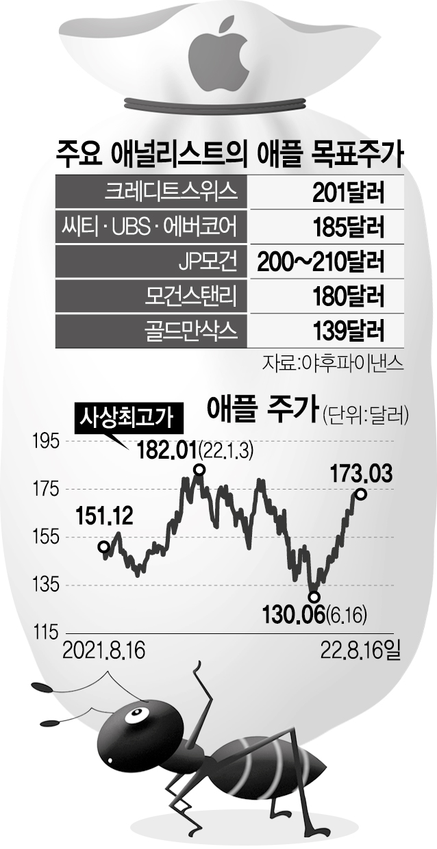 월가의 투자은행들도 비슷한 의견이다. 크레디트스위스(CS)의 애널리스트인 섀넌 크로스는 “18억 대가 넘는 애플 기기들은 회사의 서비스 및 소프트웨어 제품의 시장 채택을 가속화하고 있다”며 “애플의 서비스 매출은 두 자릿수의 성장을 이룰 것이며 인플레이션과 강달러 등으로 인한 어려움을 상쇄할 것”이라고 했다. 이날 CS는 애플의 투자 의견을 ‘중립’에서 ‘아웃퍼폼’으로 조정하고 목표 주가도 201달러로 올려 잡았다. UBS의 데이비드 포크트는 올 가을 새 아이폰 출시를 앞두고 8월 한 달 주가가 급등할 가능성이 높다고 예상했다. UBS는 애플의 목표 주가를 주당 185달러로 제시했다.