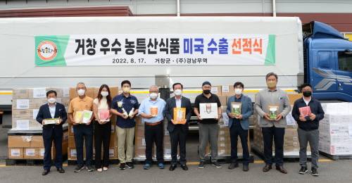 경남 거창군은 17일 남상면 소재 ㈜농업회사법인 하늘바이오(대표 윤효미)에서 구인모 거창군수를 비롯한 관계자 11명이 참석한 가운데 '거창군 농특산식품 미국 온·오프라인 안테나숍 운영'을 위한 미국 수출 선적식을 했다.