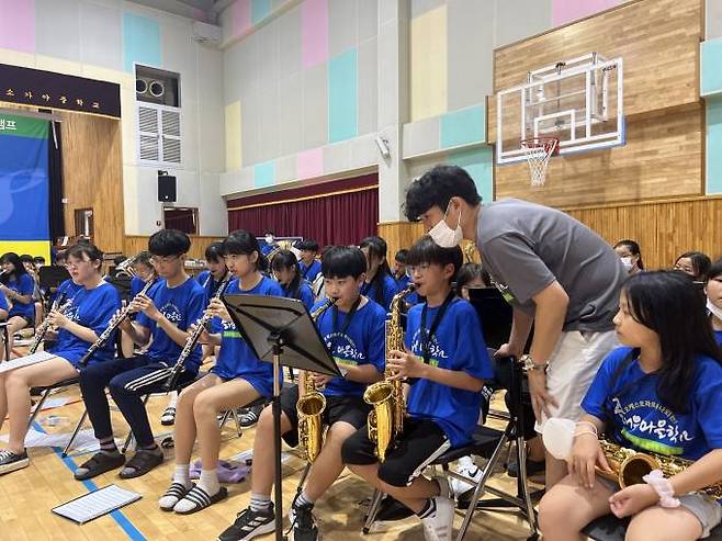 여름캠프에는 학교연합 예술형 마을학교 중점학교인 소가야중학교를 비롯하여 경남고성음악고, 삼산초, 상리초, 하이초, 하일초 등 인접한 6개 초·중·고 참가 희망 학생 101명과 지도교사, 마을교사가 함께 참여하여 오케스트라를 주제로 예술교육 활동을 했다.