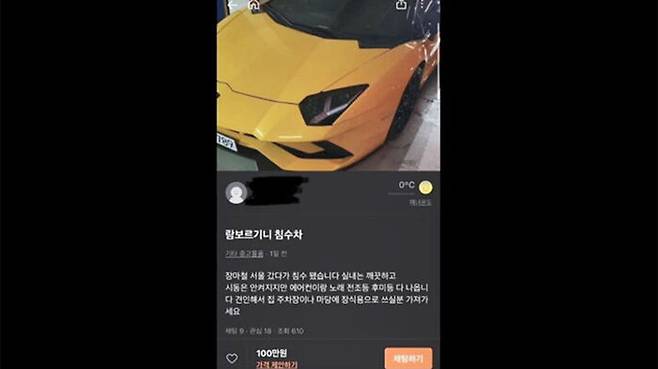 판매 글을 올린 A 씨는 노란색 람보르기니 차량 사진과 함께 "장마철 서울에 갔다가 침수됐는데 실내는 깨끗하다", "견인해서 집 주차장이나 마당에 장식용으로 쓰실 분은 가져가라"고 안내했습니다.