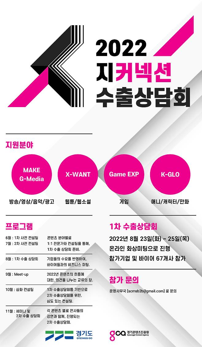 경기콘텐츠진흥원(이하 경콘진)은 경기도 콘텐츠 기업의 해외진출을 지원하는 '2022 지커넥션 수출상담회'를 오는 23일부터 25일까지 진행한다.