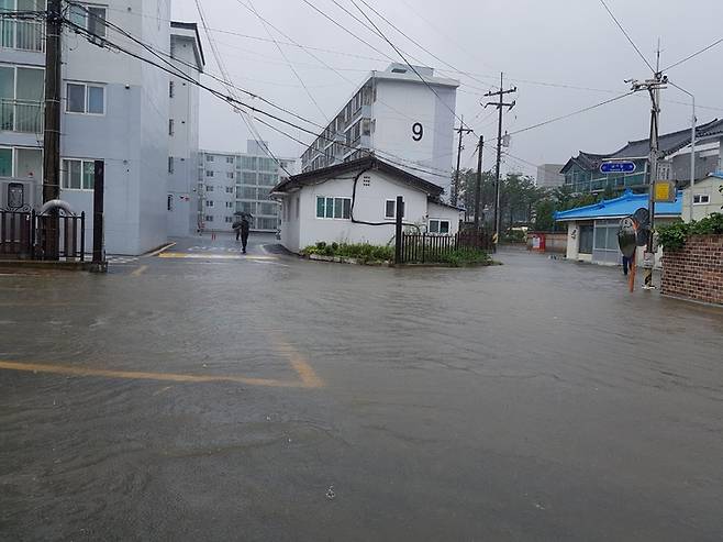 [양양=뉴시스] 김경목 기자 = 17일 오후 강원 양양군의 한 마을 아파트 일대가 동풍의 영향으로 내리고 있는 많은 비에 침수되고 있다. (사진=양양군청 제공) 2022.08.17. photo@newsis.com