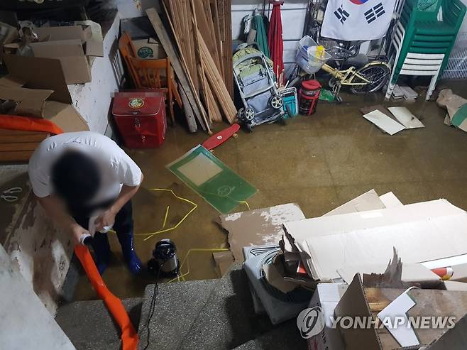 (양양=연합뉴스) 17일 오후 호우경보 속에 쏟아진 폭우로 피해가 발생한 양양군 침수지역에서 배수작업이 진행되고 있다.