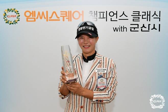 (서울=연합뉴스) 김선미(49)가 17일 전북 군산의 군산 컨트리클럽에서 열린 KLPGA 엠씨스퀘어 챔피언스 클래식에서 최종 합계 9언더파 135타로 우승했다. 사진은 우승 트로피를 들고 기념 촬영하는 김선미. 2022.8.17 [KLPGA 투어 제공. 재판매 및 DB 금지]