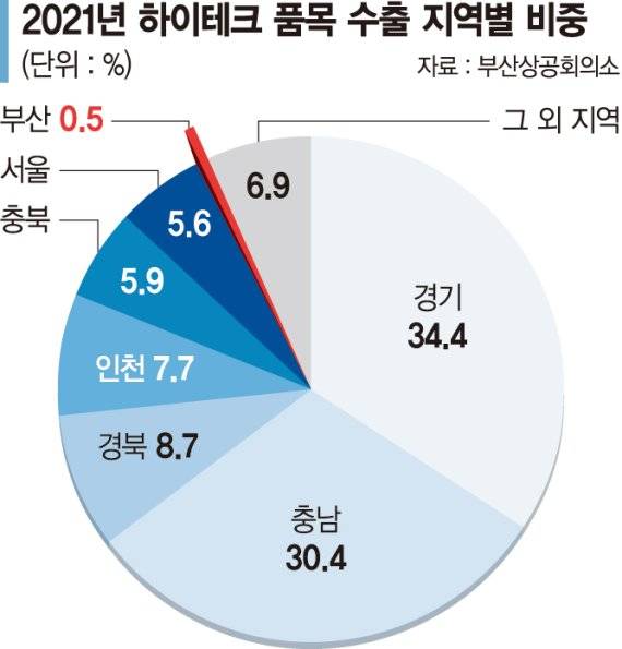 지난해 하이테크 품목 수출비중은 부산 전체 수출에서 6.8%을 기록했으나 국내 수출 기준으로는 0.5%에 불과했다. 이는 같은 기간 국내 총수출에서 하이테크 품목이 31.5%나 차지한 것과 대조적이다.
