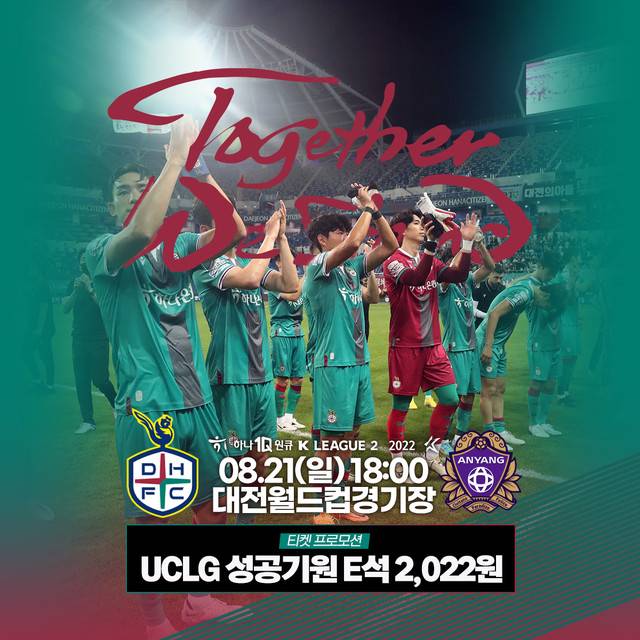 대전은 오는 21일 FC 안양를 상대로 홈경기에서 '2022 대전 UCLG 성공개최 기원' 티켓 프로모션을 실시한다고 밝혔다.