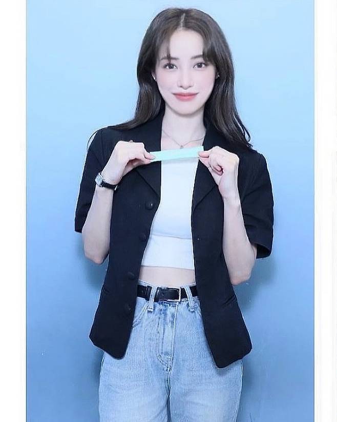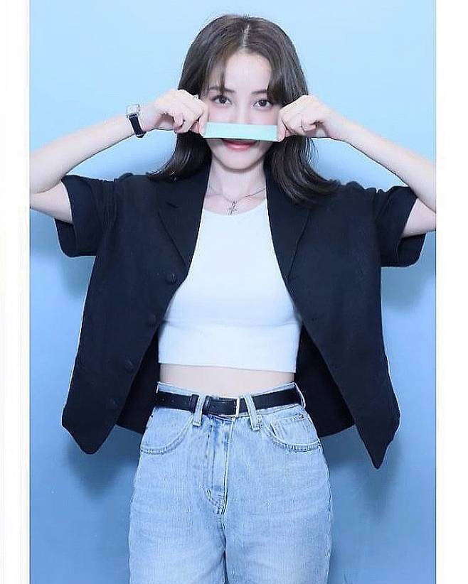 청바지에 티셔츠와 재킷을 입은 모습에서도 미모가 돋보인다. 특히 개미허리같이 늘씬한 허리와 복근을 드러내 눈길을 끌고 있다.
