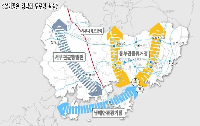 성장잠재력이 높은 서부권은 △남부내륙고속철도 역세권 개발 △함양-울산간 고속도로 건설 △우주항공청 및 첨단 기반시설 확충과 연계해 상습 지정체 구간인 남해고속도로 사천IC-하동IC구간 확장 △서부내륙을 통과하는 진천~합천 고속도로의 남해안까지 기점연장 등으로 지역 균형발전 축을 마련할 계획이다.