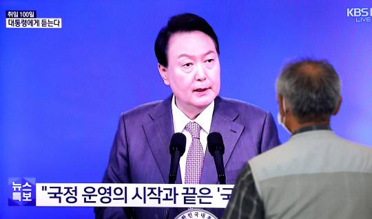 17일 대전역 대합실에서 시민들이 윤석열 대통령의 취임 100일 기자회견을 TV 생중계를 통해 지켜보고 있다.