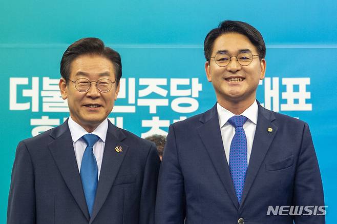 [광주=뉴시스] 이영주 기자 = 더불어민주당 당대표 선거에 나선 이재명 후보와 박용진 후보가 17일 오후 광주 서구 KBS광주방송총국에서 열린 당대표 후보자 초청 토론회에서 기념촬영을 하고 있다. 2022.08.17. leeyj2578@newsis.com