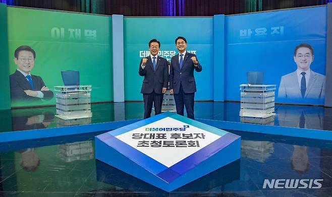 [광주=뉴시스] 이영주 기자 = 더불어민주당 당대표 선거에 나선 이재명 후보와 박용진 후보가 17일 오후 광주 서구 KBS광주방송총국에서 열린 당대표 후보자 초청 토론회에서 기념촬영을 하고 있다. 2022.08.17. leeyj2578@newsis.com