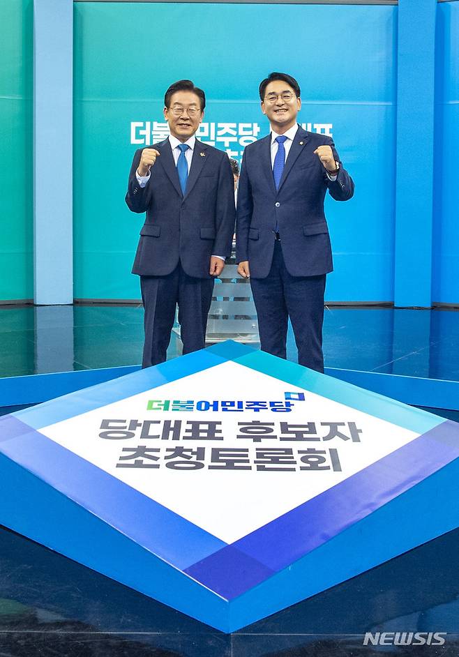 [광주=뉴시스] 이영주 기자 = 더불어민주당 당대표 선거에 나선 이재명 후보와 박용진 후보가 17일 오후 광주 서구 KBS광주방송총국에서 열린 당대표 후보자 초청 토론회에서 기념촬영을 하고 있다. 2022.08.17. leeyj2578@newsis.com