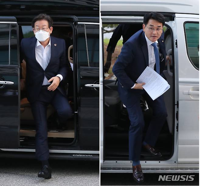 [광주=뉴시스] 이영주 기자 = 더불어민주당 당대표 선거에 나선 이재명 후보와 박용진 후보가 17일 오후 광주 서구 KBS광주방송총국에서 열린 당대표 후보자 초청 토론회에 참석하기 위해 차량에서 내리고 있다. 2022.08.17. leeyj2578@newsis.com