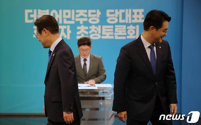 (광주=뉴스1) 이수민 기자 = 더불어민주당 당 대표에 출마한 이재명 후보(왼쪽)와 박용진 후보가 17일 광주 KBS스튜디오에서 열린 토론회에 앞서 기념촬영을 하고 있다. 2022.8.17/뉴스1