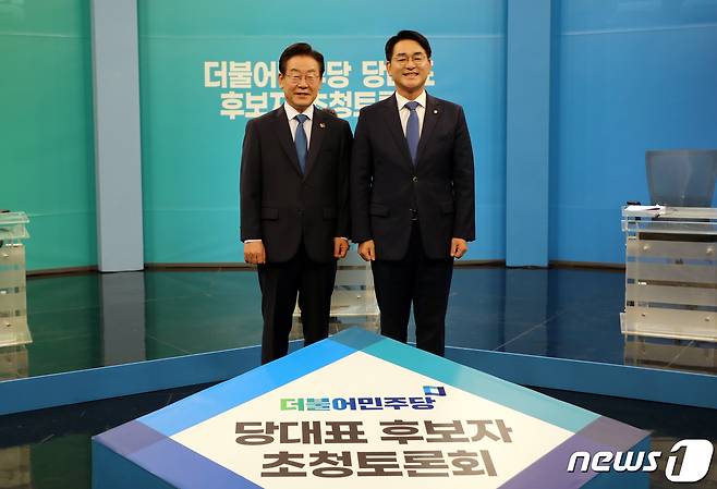 (광주=뉴스1) 이수민 기자 = 더불어민주당 당 대표에 출마한 이재명 후보(왼쪽)와 박용진 후보가 17일 광주 KBS스튜디오에서 열린 토론회에 앞서 기념촬영을 하고 있다. 2022.8.17/뉴스1