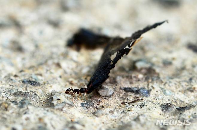 [남해=뉴시스] 차용현 기자 = 17일 오후 경남 남해군 남해읍 인근 길가에서 개미 한 마리가 자신보다 몇 배나 큰 곤충의 날개를 입에 물고 이동하고 있다. 2022.08.17. con@newsis.com