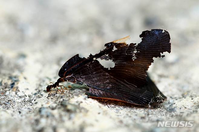 [남해=뉴시스] 차용현 기자 = 17일 오후 경남 남해군 남해읍 인근 길가에서 개미 한 마리가 자신보다 몇 배나 큰 곤충의 날개를 입에 물고 이동하고 있다. 2022.08.17. con@newsis.com