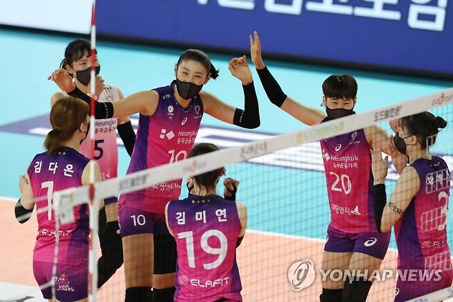 (순천=연합뉴스) 정회성 기자 = 17일 전남 순천시 팔마체육관에서 열린 2022 순천·도드람컵 프로배구대회 여자부 조별예선 흥국생명과 GS칼텍스의 경기. 2세트 흥국생명 선수들이 득점에 성공하자 기뻐하고 있다. 2022.8.17
