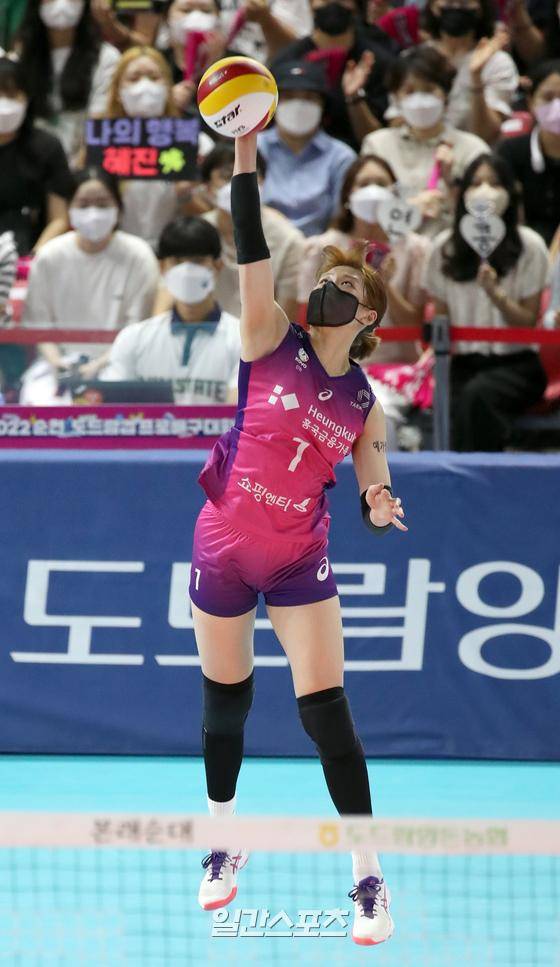 '2022 순천·도드람컵 프로배구대회' 흥국생명과 GS칼텍스의 경기가 17일 오후 전남 순천 팔마체육관에서는 열렸다. 흥국생명 김나희가 서브하고 있다.