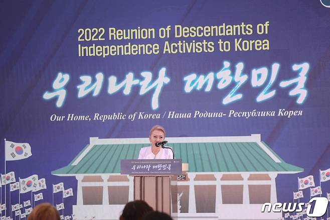 (서울=뉴스1) = 17일 서울 중구 앰버서더호텔에서 열린 국외거주 독립유공자 후손 초청 감사만찬에서 카자흐스탄 후손 대표 박 타티아나씨가 답사를 하고 있다. (국가보훈처 제공) 2022.8.17/뉴스1
