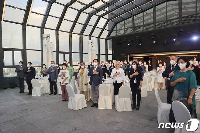 (서울=뉴스1) = 박민식 국가보훈처장이 17일 서울시 중구 앰버서더호텔에서 열린 국외거주 독립유공자 후손 초청 감사만찬에 참석하여 독립유공자 후손 32명을 함께 국민의례를 하고 있다. (국가보훈처 제공) 2022.8.17/뉴스1