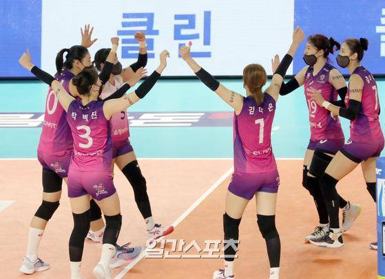 '2022 순천·도드람컵 프로배구대회' 흥국생명과 GS칼텍스의 경기가 17일 오후 전남 순천 팔마체육관에서는 열렸다. 흥국생명이 득점한뒤 선수들이 기뻐하고 있다.