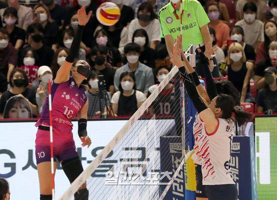 '2022 순천·도드람컵 프로배구대회' 흥국생명과 GS칼텍스의 경기가 17일 오후 전남 순천 팔마체육관에서는 열렸다. 흥국생명 김연경이 강타를 날리고 있다.