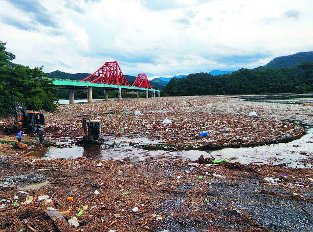 집중호우 때 충주호로 유입된 부유물로 인해 17일 충북 제천시 수산면 옥순대교 아래에 거대한 쓰레기섬이 형성됐다. 한국수자원공사는 수면에 떠 있는 부유물을 한곳에 모아 놓은 상태다. 유입된 부유물 양은 1만5000㎥에 달한다. 부유물 수거작업은 앞으로 2주가량 소요될 것으로 예상된다.