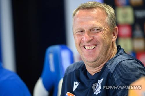 epa10125597 Lech's head coach John van den Brom during a press conference in Poznan, Poland, 17 August 2022. Lech players are preparing for their match against F91 Dudelange, on 18 August, in the 4th round of the Conference League qualifiers. EPA/Jakub Kaczmarczyk POLAND OUT