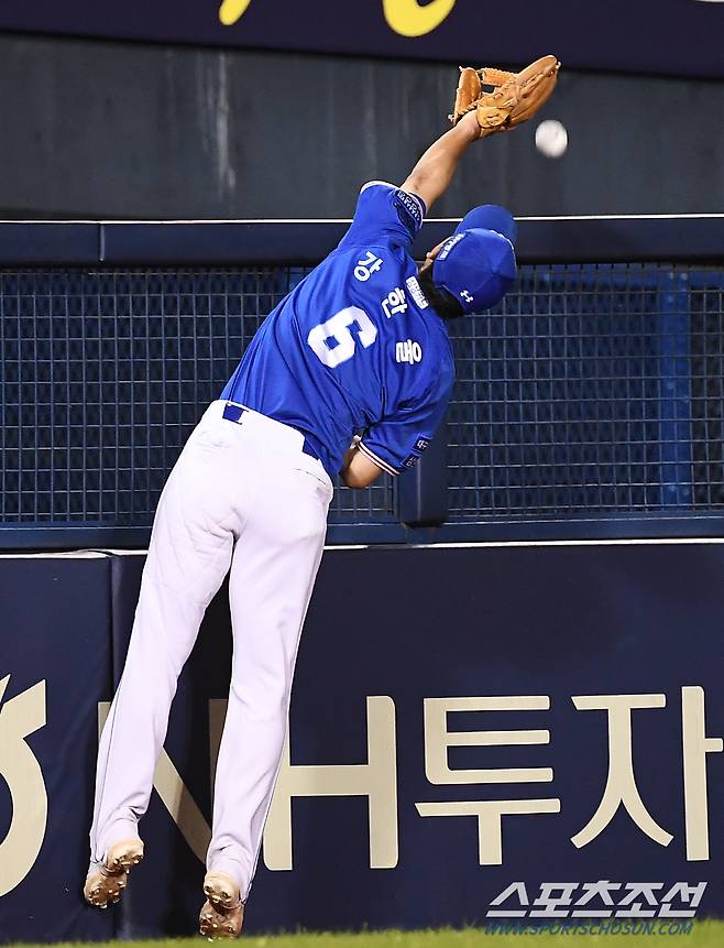2022 KBO리그 LG 트윈스와 삼성 라이온즈의 경기가 17일 잠실구장에서 열렸다. 7회말 무사 1루 LG 문성주의 내야 뜬공을 삼성 3루수 강한울이 마지막 순간 놓치고 있다. 잠실=박재만 기자 pjm@sportschosun.com/2022.08.17/